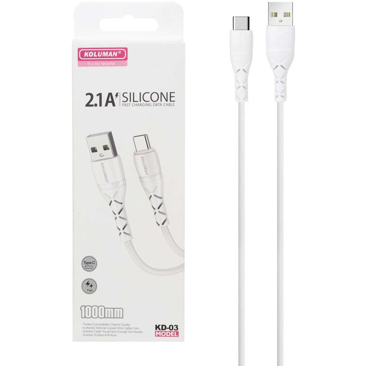 کابل تبدیل USB به Type-C کلومن مدل KD-03 طول 1 متر، کابلی مقرون به صرفه با کیفیت عالی جهت اتصال گوشیها و دستگاهها که دارای پورت Type-C هستند میباشد. کابل کلومن مدل KD-03 از جنس TPE ساخته شده و ضد کشش و پارگی میباشد. همچنین این محصول میتواند به شارژ و انتقال اطلاعات دستگاههای Type-C شما بپردازد. این کابل دارای رشته سیم با جنس مس 4 لایه است که علاوه بر شارژ سریع دستگاه، میتوانید قابلیت انتقال اطلاعات را نیز داشته باشید.