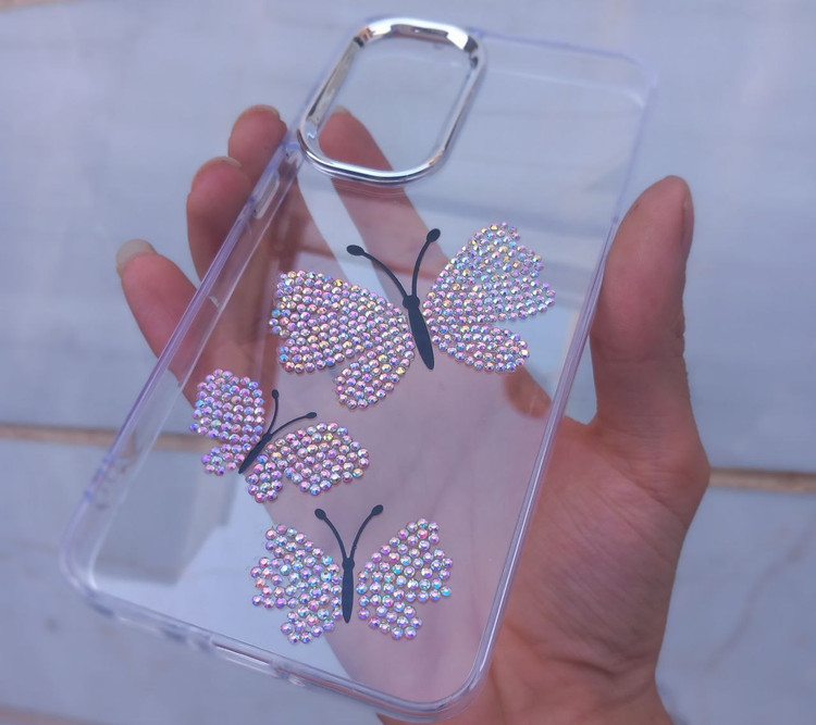 قاب فانتری دخترانه گوشی آیفون12promax بیرنگ شفاف طرح پروانهای برجسته اکریلیک فانتزی محافظ موبایل