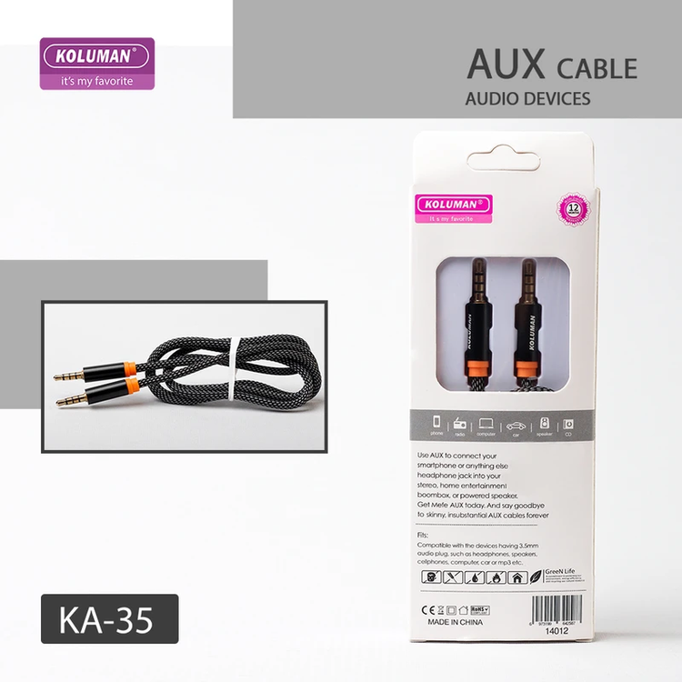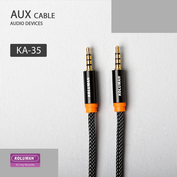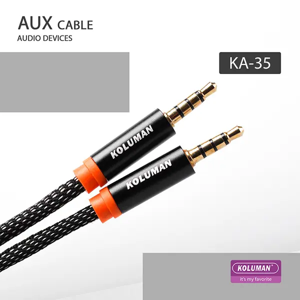یکی از راه های اتصال به اسپیکر ها و هدفون ها برای پخش موسیقی از طریق پورت AUX می باشد. کابل AUX کلومن مدل KA - 35 محصولی از کمپانی KOLUMAN بوده که طولی معادل 100 سانتی متر داشته و برای اتصال به هدفون ، اسپیکر و پخش ماشین مناسب می باشد. کمپانی کلومن به منظور مقاومت بالای کابل بر روی آن یک روکش از الیاف در هم تنیده کشیده تا مقاومت آن در برابر کشش ، پارگی و گره خوردن از سطح بالایی برخوردار باشد. سوکت های این کابل به صورت فلزی طراحی شده و مقاومت آن را در برابر ضربه و خط و خش بسیار بالا برده است. در قسمت انتهای سوکت های این کابل یک قسمت سیلیکونی قرار دارد که در صورت خم شدن کابل از آن نقطه هرگز آسیبی به کابل و سوکت آن وارد نمی شود.